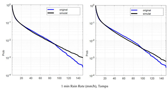 Tampa. Probability distribution that the 1 min rain rate in abscissa is exceeded in the experimental data, , blue line, and in the simulated 1 min data, , black line. Left panel: is obtained by using local values of the conditional PDFs. Right panel: is obtained by using Spino d’Adda conditional PDFs (Table 2).