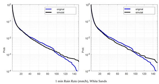 White Sands. Probability distribution that the 1 min rain rate in abscissa is exceeded in the experimental data, , blue line, and in the simulated 1 min data, , black line. Left panel: is obtained by using local values of the conditional PDFs. Right panel: is obtained by using Spino d’Adda conditional PDFs (Table 2).