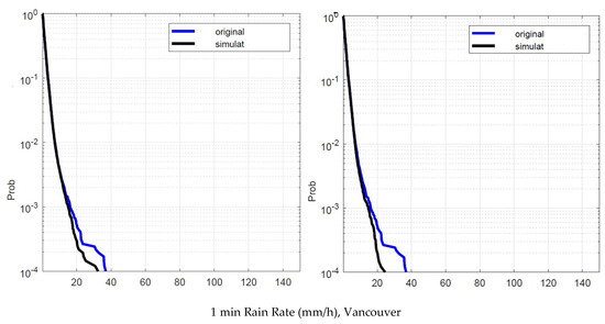 Vancouver. Probability distribution that the 1 min rain rate in abscissa is exceeded in the experimental data, , blue line, and in the simulated 1 min data, , black line. Left panel: is obtained by using local values of the conditional PDFs. Right panel: is obtained by using Spino d’Adda conditional PDFs (Table 2).