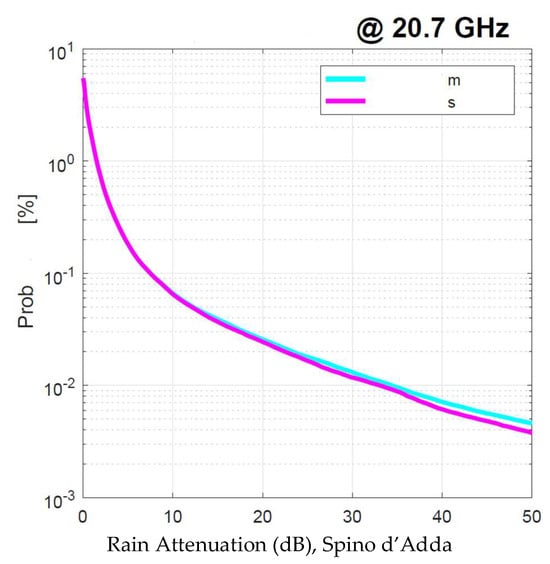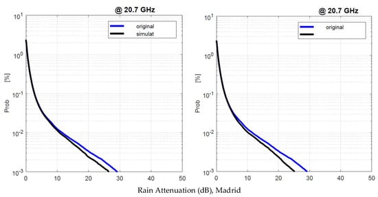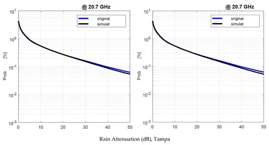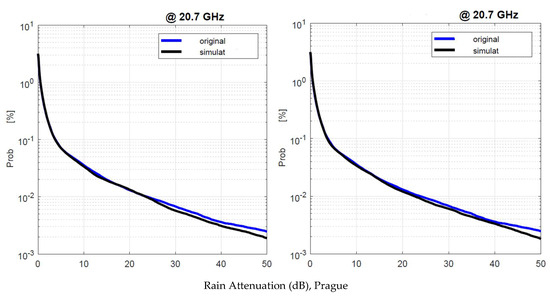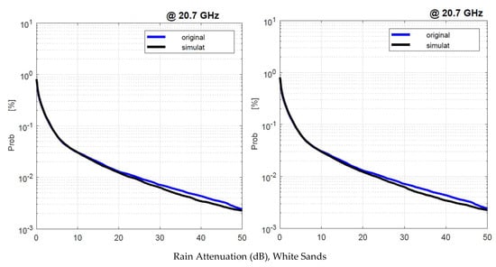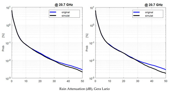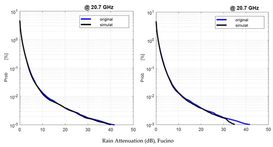 We applied the SST twice: first, by using as input the experimental 1 min rain rate time series, namely, , and second, by using the simulated . Figure 19 shows the annual average rain attenuation probability distributions obtained with and with . There are no appreciable differences that can impact the satellite system design.