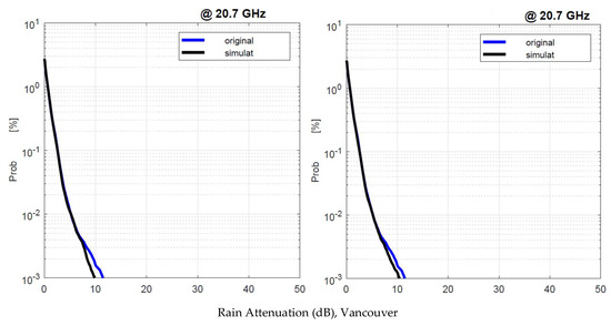 Afterward, we used the two sets of 1 min rain rate time series (i.e., that measured and simulated 10 min rain rate time series) as the input to the SST for simulating—as an example application—rain attenuation time series at 20.7 GHz in 35.5° slant paths to geostationary satellites at the sites in Table 1. The conclusion of our exercise is that the two rain attenuation probability distributions in an average year show no significant differences that can affect satellite system design at centimeter or millimeter frequencies; so, the method can be used very reliably for this purpose.