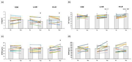 Figure 2 shows the results for the differences in myokine changes. IL-6 showed an interaction effect (Wald χ2 = 9.96, p = 0.007) and a main effect by time (Wald χ2 = 4.72, p = 0.030). Post hoc analysis showed that IL-6 in LI-HR and HI-LR were significantly reduced in post compared to pre (p = 0.033, p = 0.015). IGF-1 showed an interaction effect (Wald χ2 = 8.38, p = 0.015), a main effect by time (Wald χ2 = 13.55, p < 0.001) and a group effect (Wald χ2 = 10.67, p = 0.005). Post hoc analyses showed that IGF-1 in the LI-HR and HI-LR groups each increased significantly post compared to pre (p = 0.003, p < 0.001). These two groups also showed a significant difference in post compared to CON (p = 0.012, p < 0.001) (Figure 2b). SPARC also showed an interaction effect (Wald χ2 = 6.14, p = 0.046) and a main effect of time (Wald χ2 = 5.09, p = 0.024). Post hoc analysis revealed that HI-LR was increased significantly post compared to pre (p = 0.021). BDNF showed only a main effect of time with no interaction effect (Wald χ2 = 5.84, p = 0.016). The LI-HR and HI-LR groups showed a trend toward an increase of 22.3% and 10.7%, respectively.