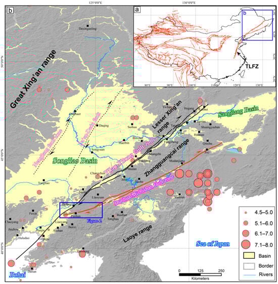 (a) Simple geological map of the study area. (b) The spatial distribution of active faults and destructive earthquakes (419–2019, Ms ≥ 4.7) in Liaoning and adjacent areas revised from Deng et al. (2007) [].