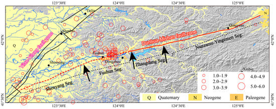 In this study, the Hunhe fault is divided into segments based on the following five aspects: the fault structure and movement characteristics of the fault, transverse faults and obstruction structures, geological and geomorphological characteristics, seismic features, and fault activity. The detailed segments are as follows: the Shenyang segment, the Fushun segment, the Zhangdang-Nan Zamu segment, and the Nan Zamu to Ying Emeng East section (Figure 2).