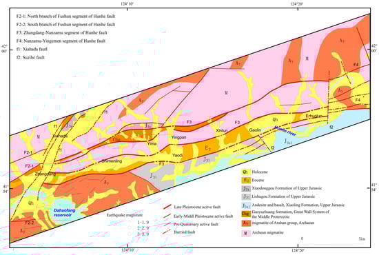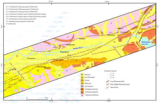 Detailed structure and seismic tectonic map of the Hunhe fault in the Fushun segment.