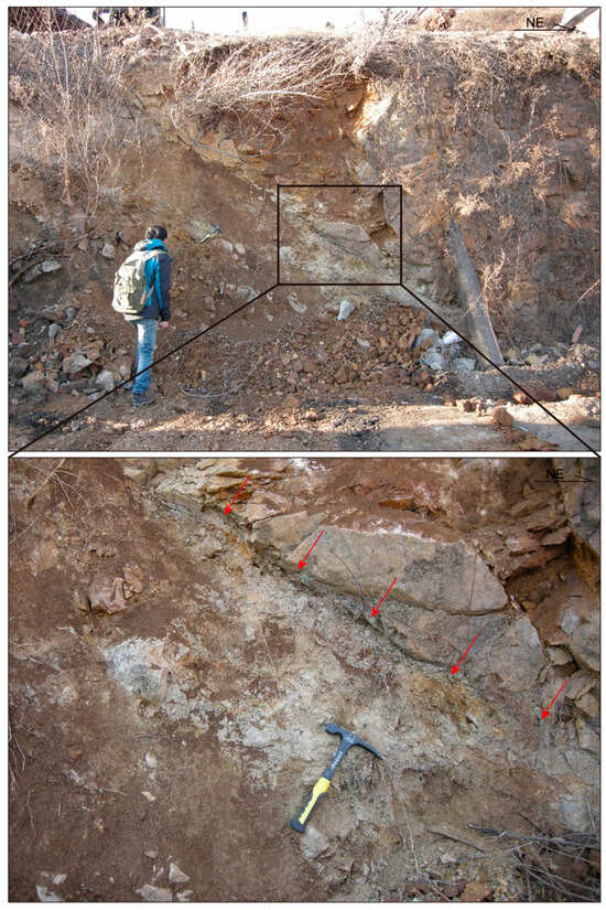 Fault movement surface of the Hunhe fault zone (photo courtesy of Bo Wan). The red arrows show the fault fracture zone of Hunhe fault in the lower photo. The black frame in the upper photo indicates the location of lower photo.