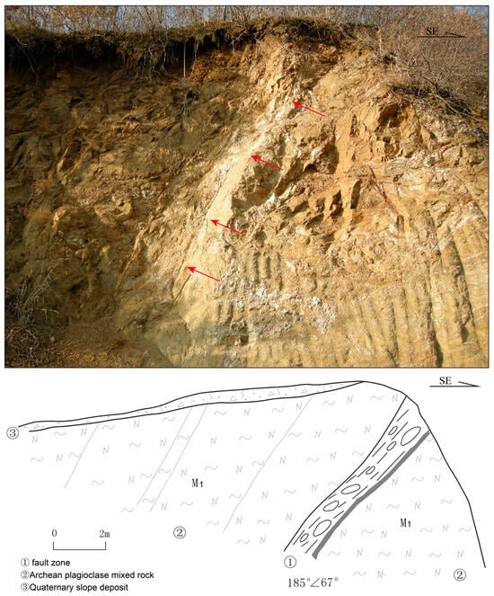 In the vicinity of Fushun, a wide fault zone which constitutes a series of close-spaced faults [,] (Brandes and Tanner, 2020; Van der Pluijm and Marshak, 2004) has formed a graben basin, trending NEE, with some local segments approaching an east–west orientation. Although most of the area remains concealed, there are also sections that are exposed. The fault extending from the Fushun Basin eastward to Nanzamu is widely exposed in the low hilly region, exhibiting clear composite branching characteristics with a relatively stable orientation, typically between 75° and 80°. In the section from Nanzamu to Yingemen, the development morphology of the fault is similar to that of the Fushun section, but its northern and southern branches exert relatively weaker control over the Hunhe graben basin, showing poorer scale and continuity, with significant variations in orientation. The orientation from Nanzamu to Beikouqian is between 70° and 80°, while the section from Qingyuan to Yingemen exhibits an NE–NEE orientation.