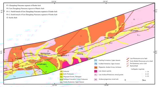 The Hunhe fault zone intersects with multiple fault structures within its distribution area (Figure 1b). In addition to the Yilan–Yitong fault and the Chifeng–Kaiyuan fault at its eastern and western ends, there are also regional faults such as the Suzihe fault and the Xiahada fault. Among them, the shovel-shaped western section of the Suzihe fault trends NW and intersects the Hunhe fault in the Nanzamu Basin, while the NE-trending Xiahada fault intersects with the Hunhe fault near Zhangdang. Research indicates that the east–west-trending Chifeng-Kaiyuan fault zone belongs to the superlithospheric structure and is massive in scale []; it controls the development and evolution of geological structures on both sides and defines the distribution of the Hunhe fault. This fault serves as the boundary between the Jilin–Helongjiang Fold Belt and the Sino-Korean Platform, which are primary tectonic units.