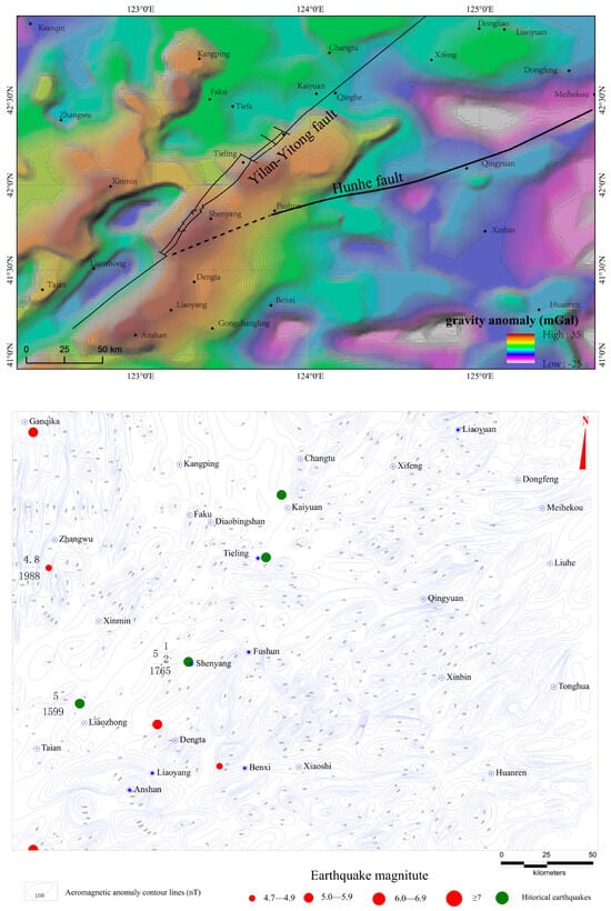 The results from the artificial seismic method [] indicate that the large-scale Hunhe fault segment in Fushun significantly displaces the bedrock strata but does not cut through the overlying MIS 2-5 strata. This segment falls within a gravity field characterized by negative anomalies, with relatively complex magnetic variations (Figure 11). The area north of the fault zone is a negative field region, while the south is predominantly a positive field region. The crustal thickness is greater than in the Shenyang segment, and the east–west gradient variation transitions to a north–south direction, indicating a transitional zone. Seismic activity in this fault segment is much weaker than in the Shenyang segment, with only one significant earthquake recorded near the fault—an M5.0 earthquake at Dongzhou Fort in 1496 []. Aside from this, there are no records of destructive earthquakes, and recent seismic activity is also notably reduced, mainly consisting of mining-induced seismic events. These minor tremors are generally aligned along an NEE trend, with locations close to the Hunhe fault, suggesting a correlation between mining activity and the fault.