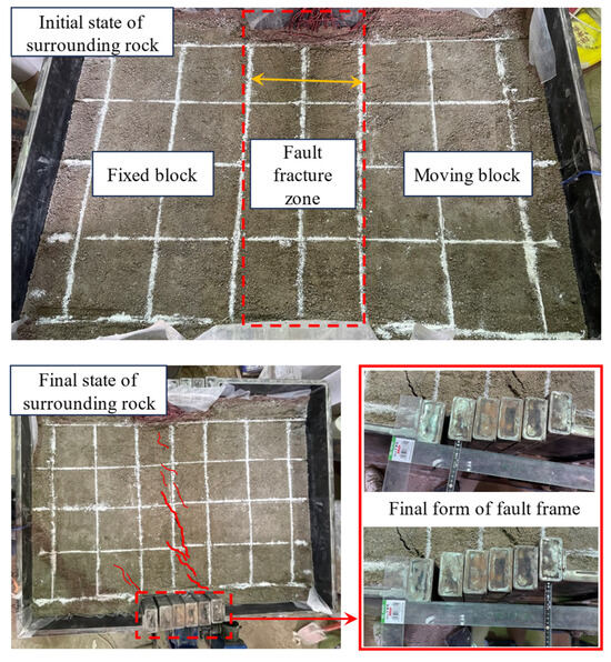- Set up the model box, adjust the loading device to a rate of 1 mm/min, and ensure all fault dislocation frames are leveled.