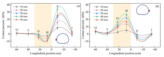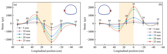 - The axial strain in the conventional tunnel shows significant variation within the range of −20 cm to 30 cm on both sides of the fault plane. The axial stress on the left and right side walls exhibits an anti-symmetric relationship relative to the fault plane. The left side wall experiences contact pressure in the moving block area, while the right side wall is under contact pressure in the fracture zone. Dehollowing and loosening zones of peripheral rock appear on both sides of the fault plane.