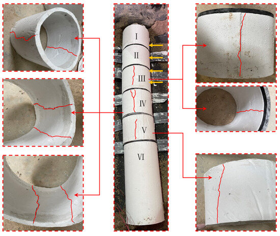 - The disaster reduction effect of the tunnel with combined anti-dislocation measures is significant, effectively controlling both the damage range and severity. Damage is mainly concentrated in sections III~V. Observing the test damage and analyzing the strain data reveal that the combined measures greatly improve the tunnel’s stress state, reducing the peak axial strain by 93% compared to the conventional tunnel. Under fault dislocation, numerous longitudinal cracks appeared on the inner and outer surfaces of the lining, indicating that the damage in the tunnel with combined measures is primarily caused by circumferential stress.