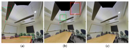 (a–c) are patches obtained through stereographic projection, rectilinear projection, and CAP projection (d = 0.4, νc = 0.3), respectively. It can be seen that the CAP projection balances the defects of the first two projections and reduces the overall distortion. The red box shows the geometric distortion that occurs at the edge of the image compared to the green box at the center. (a) Stereographic projection. (b) Rectilinear projection. (c) CAP (d = 0.4, νc = 0.3).
