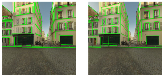 To further improve the accuracy and efficiency of projection, we optimize the CAP projection in three ways. First, in terms of extracting straight-line bending features, we change the line-segment detector EDLines [27] to ELSED [28]. The key to ELSED is the local-segment growing algorithm, which connects gradient-aligned pixels in the presence of small discontinuities. This approach greatly improves the accuracy and time efficiency of line-segment detection. We adapt it based on its advantages and change the subsequent line-segment merging calculation algorithm. As shown in Figure 4, the line segment extraction effect has been improved, more short lines are merged into long lines, and more very close straight lines are discarded. This makes the calculation of line curvature (LC) and line inclination (LI) more accurate, thereby improving the calculation accuracy of straight line curvature features. The measurement method of LI and LC is shown in Figure 5. Second, in extracting object stretching features, we chose a combination of semantic segmentation [29] and Tissot’s indicatrices [30] (The measurement method is shown in Figure 5). Third, in terms of feature calculation, this research refers to the classification error method [31] used in [32] to evaluate the effectiveness of various pooling functions such as Sum, Average, Max, Min, and multiple distortion measurement methods [26,33]. Finally, the pooling function P is used to calculate the straight line bending feature Line distortions combination (LMC) [26], as shown in Formula (7), and the pooling function PF is used to calculate the object bending feature OAD [26], as shown in Formula (8). In the experiment, they all demonstrate improvements in both time efficiency and overall performance.
