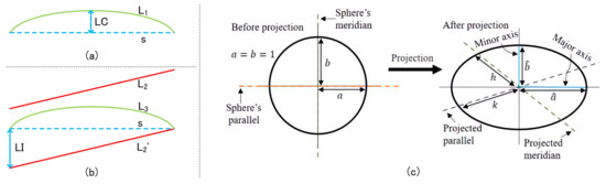 Illustration of line curvature (LC), line inclination (LI), and Tissot’s indicatrix measurement methods: (a) The curved projection line (represented by the green solid line) after CAP projection, the dotted line s (represented by the blue dotted line) connecting the endpoints of the projection line , and the line curvature LC is defined as the maximum distance between and s. (b) The straight line (represented by the red solid line) obtained by straight line projection, the curved projection line (represented by the green solid line) after CAP projection, and the endpoints of and are connected by translation. The line inclination LI is defined as the maximum distance between and s. (c) Left: the infinitesimal unit circle defined on the sphere; right: the corresponding Tissot index after projection on the plane.