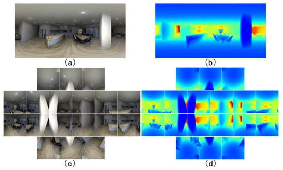 In addition, the segmentation method of the ERP image affects the amount of structural details contained in the tangential image and the inference speed of the model. This research splits it into a set of N = 18 tangential images [16] to balance performance and speed (related ablation experiments are in Section 4.3). It samples 3, 6, 6, and 3 tangent images at four different latitudes, respectively (Figure 6), and all tangent images share the same resolution and FoV. This non-uniform sampling ensures that the sampling blocks near the poles do not overlap excessively. Thanks to our more effective and efficient projection method, the tangential images have a wider FoV and a smaller geometric distortion, as well as achieve a more accurate depth prediction of the model.