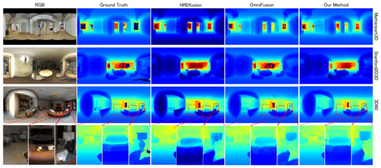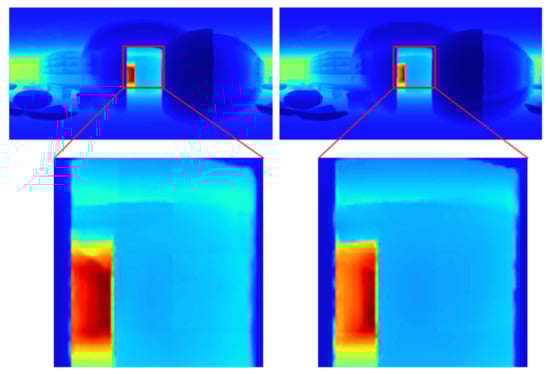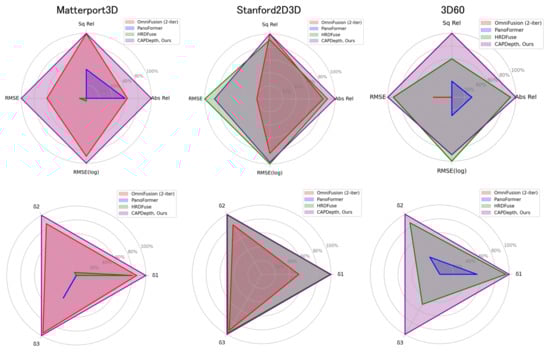We experimentally evaluate CAPDepth on three benchmark datasets: Stanford2D3D [36], Matterport3D [37], and 3D60 [3]. They are the most commonly used datasets for 360-degree panoramic depth estimation (such as PanoFormer [22], HRDfusion [17], OmniFusion [16], GLPanoDepth [21], etc., which have been used as experimental datasets in recent years), covering different types of scenes and data formats, and providing extensive and high-quality training and test samples. Matterport3D, a real-world dataset, was collected using the Matterport Pro 3D camera (Matterport, Inc., Sunnyvale, CA, USA), which contained 10,800 indoor panoramic images. Stanford2D3D and Matterport3D were collected in the same way, with a total of 1413 real panoramic images. Due to noise and missing data from the ToF sensor during collection, the ground-truth depth maps in these two datasets were inaccurate in some areas. In our experiments, we adjust the resolution to 512 × 1024. Moreover, 3D60 includes the Stanford2D3D and Matterport3D datasets, along with the synthetic datasets SunCG [38] and SceneNet [39], resulting in a total of 35,977 panoramic images. This research uses the official training and testing splits, with a resolution set at 256 × 512.