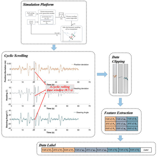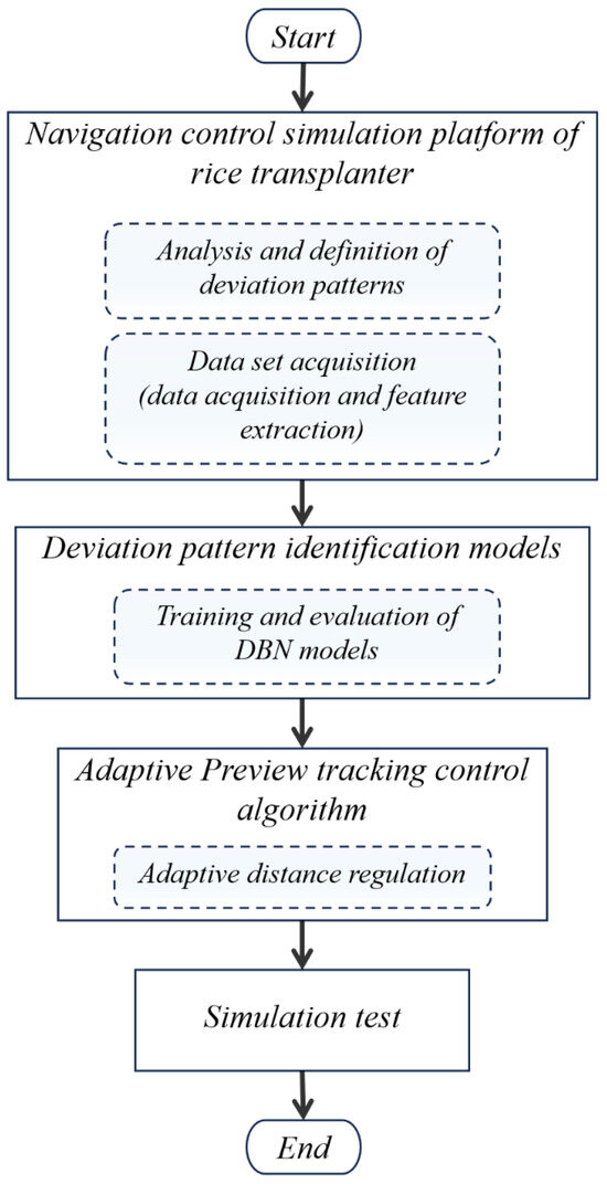 In this study, a navigation control simulation platform of a rice transplanter was constructed in MATLAB/Simulink, and the navigation deviation pattern identification models and adaptive preview distance control algorithm were added to the platform. First, in the preliminary test, according to the defined deviation pattern, the key feature variables of navigation are analyzed and obtained, and the data set is made. Then, the deviation pattern identification models are designed and trained based on DBN. Finally, an adaptive preview distance control method is designed. The overall flow is shown in Figure 1.
