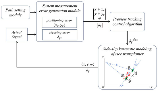 2ZGQ-80D Yangma rice transplanter (Syndmon International Co., Ltd., Changzhou, China) was taken as the research object (vehicle parameter setting), and the simulation platform is built by combining the functional units of the navigation control system, which mainly includes the sideslip kinematic model of the rice transplanter, the preview tracking control algorithm, the system measurement error generation module, and the path setting module. The overall structure is shown in Figure 2.