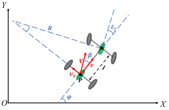 When the lateral speed , the kinematic model of the rice transplanter is shown in Equation (1):