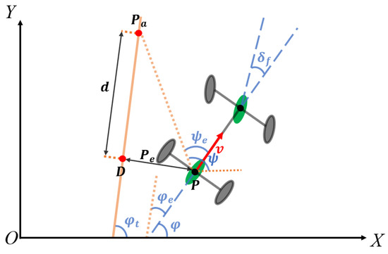 Taking the preview straight line as an auxiliary line, based on the small angle linearization method and the pole assignment method [19], the steering angle is obtained as
