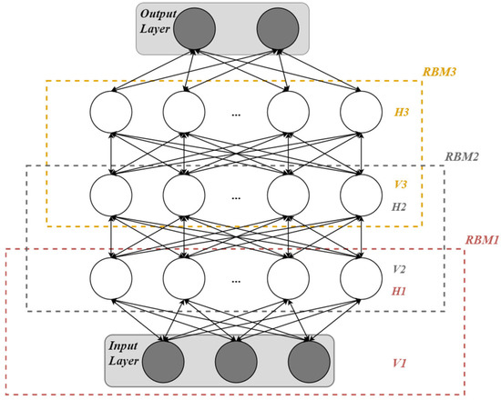 Deep Belief Network (DBN) is essentially a probabilistic generative model, which is a multilayer perceptual network stacked with Restricted Boltzmann Machine (RBM) [25], which centers on a layer-by-layer greedy learning algorithm [26]. The DBN training is divided into two phases: first, an unsupervised pre-training phase, followed by a supervised backward fine-tuning phase (which can be viewed as a BP session). Its overall structure is shown in Figure 5.