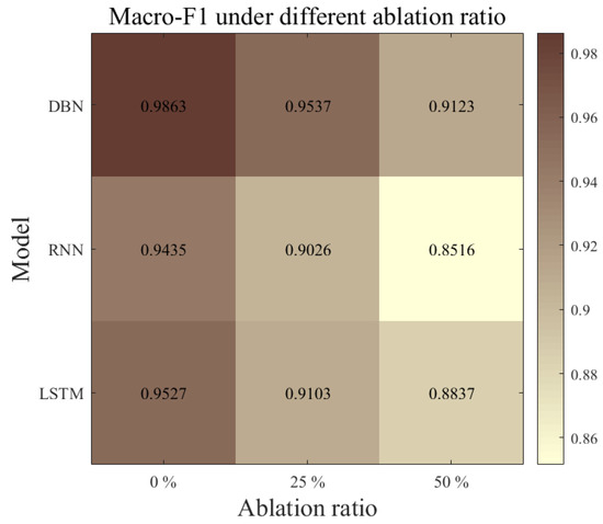 The comparative result of Figure 13 is analyzed to show that the Macro-F1 values of DBN, RNN, and LSTM show inconsistent differences at different ablation levels. The colors in the figure are from dark to light, indicating that the Macro-F1 values are from high to low. As can be seen from the figure, the Macro-F1 value of DBN decreases from 0.9863 to 0.9123 under different ablation levels but shows the most stable and excellent performance among the three deep learning methods.