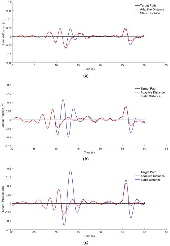 In order to clearly demonstrate the path tracking curves for the adaptive and static preview distances, the complete test cycle is split into three segments of 0–30 s, 30–60 s, and 60–90 s here, as shown in Figure 14.