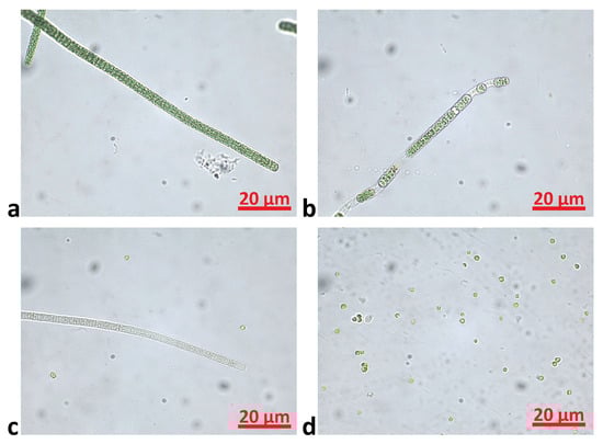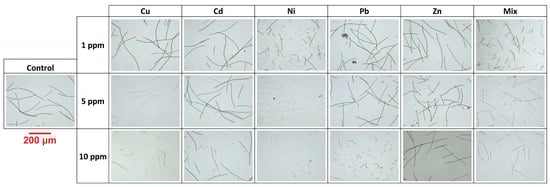 The microscopic images of the Control and the metal-treated cultures on Day 7 using a 10× objective lens are presented in Figure 1. The linear morphology of the filaments is noted, instead of a helical one. Although the morphology relates to cultivation conditions—especially with high illumination during laboratory or industrial cultivation []–this morphology of whole cultures of various Arthrospira (Spirulina) species was previously reported and discussed [] (and referenced within). In brief, straight filaments are usually reported in laboratory conditions and this morphology has been assigned to mutations associated with cultivation conditions that are under stress, as the linear form presents greater survivability. Straight filaments were also reported in wild cultures [], making this morphology widely known and accepted [].
