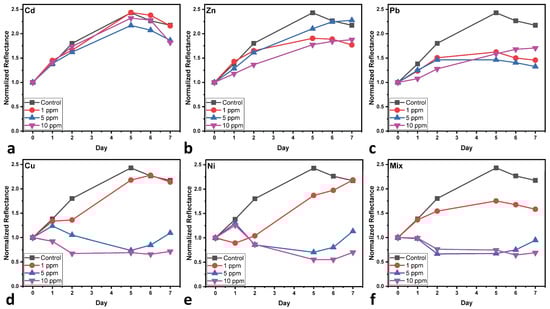 NIR reflectance response of cultures at 1062.6 nm: (a) Cd-MT; (b) Zn-MT; (c) Pb-MT; (d) Cu-MT; (e) Ni-MT; (f) Multi-MT. Values were normalized to Day 0 of cultivation to account for slight variations in initial biomass. Each value is average of two measurements, with uncertainties less than 3% over each value.