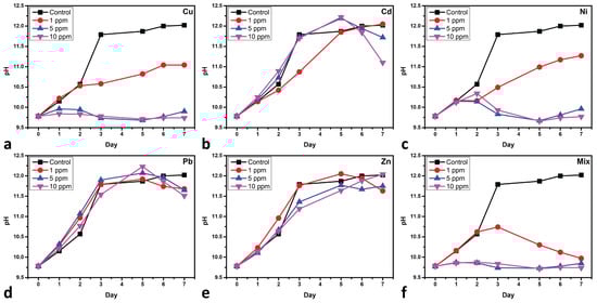 pH measurements of cultures during all cultivation days: (a) Cu-MT; (b) Cd-MT; (c) Ni-MT; (d) Pb-MT; (e) Zn-MT; (f) Multi-MT. Each value is average of two measurements, with uncertainties less than 4% over each value.