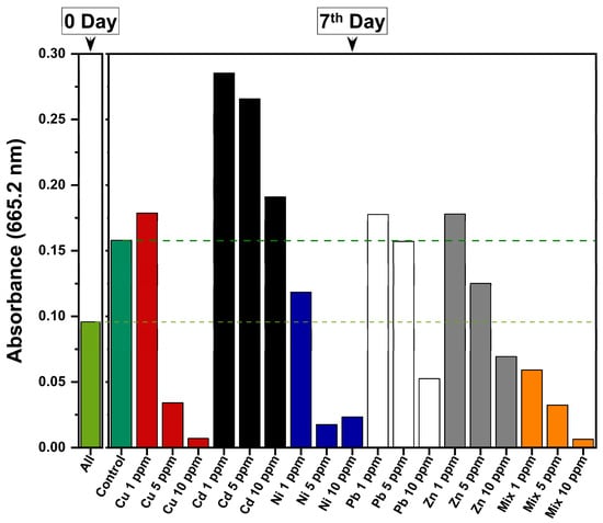 - Zn and Pb mono-MT cultures: Again, the low Zn concentration, that of 1 ppm, elevates the chlorophyll-a content. Kaamoush et al. [] showed that up to Day 7 of cultivation, 1 ppm of Zn had similar results with their Control sample, but higher concentrations had a negative effect.