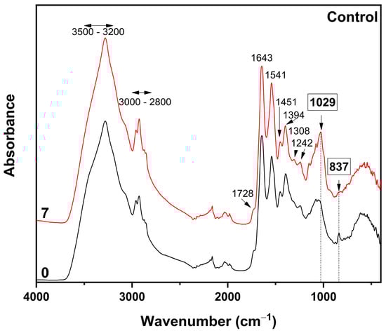 Regarding the variation in the Control culture spectra, a band at 837 cm−1 is present only in the Day 0 spectrum, while the area at 1180–950 cm−1 is stronger in Day 7, where the band at 1029 cm−1 is more intense. Both these variations are connected with saccharides [,,,,,].