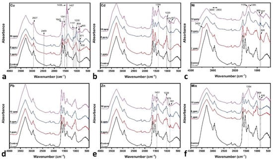 ATR-FTIR spectra of A. platensis biomass collected from all cultures on Day 7 of cultivation: (a) Cu-MT; (b) Cd-MT; (c) Ni-MT; (d) Pb-MT; (e) Zn-MT; (f) Multi-MT. Control culture spectrum is also shown for comparative reasons.