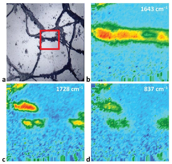 FPA/FTIR imaging analysis in micro-ATR mode of A. platensis filament (Control culture, Day 7 of cultivation). (a) Optical image (350 μm × 350 μm). Micro-ATR measured area is indicated with red rectangle (70 μm × 70 μm). FPA chemical images showing distribution of FTIR bands at (b) 1643, (c) 1728, and (d) 837 cm−1, that correspond to amide I, lipids, and saccharides, respectively.