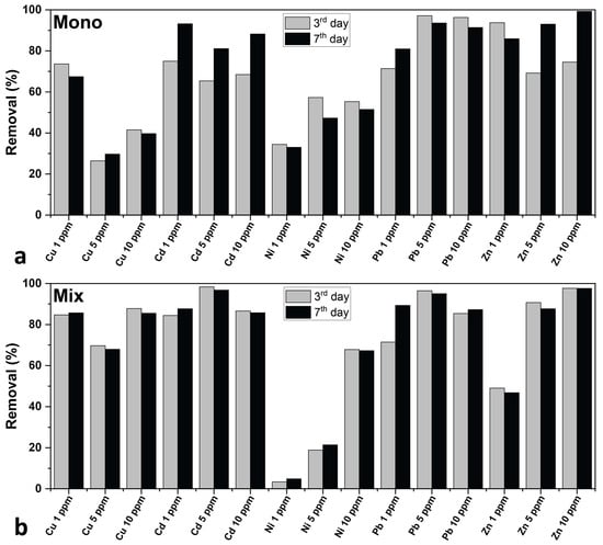 Removal (%) of heavy metals from culture media by A. platensis after mono- (a) and multi-metal (b) treatment of cultures. Each value is average of two measurements, with uncertainties less than 5%.