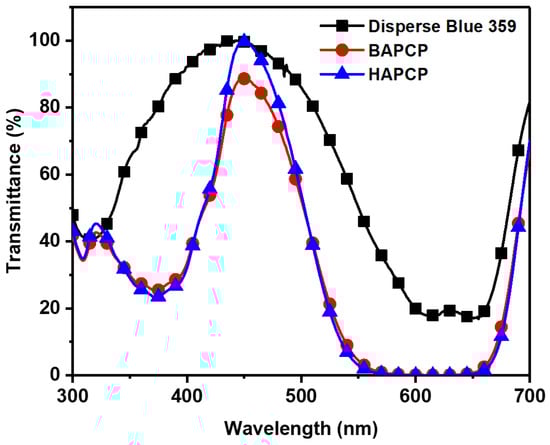 Transmittance of Disperse Blue 359 and synthesized materials in film state.