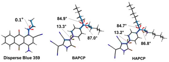 Optimized molecular structures of Disperse Blue 359 and the synthesized blue materials, calculated using B3LYP-D3/def2-TZVPP.
