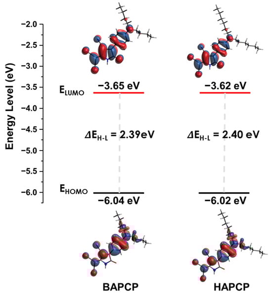 Depiction of the frontier orbitals along with a plot of the HOMO and LUMO energy levels for BAPCP and HAPCP, calculated using the B3LYP-D3/def2-TZVPP level of theory.