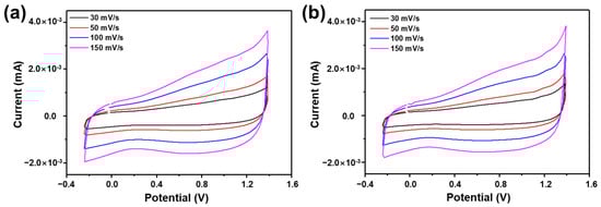 Cyclic voltammograms at scan rates of 30, 50, 100, and 150 mV/s for (a) BAPCP and (b) HAPCP.