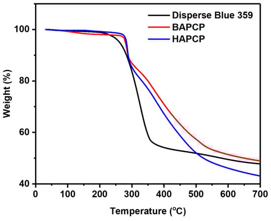 The thermal properties of the synthesized blue colorant materials were evaluated using thermogravimetric analysis (TGA) to determine Td at 5% weight loss, as summarized in Figure 7 and Table 4. The Td values of the synthesized compounds, BAPCP and HAPCP, were 279 °C and 282 °C, respectively. Compared to the Td value of 260 °C for the commercial Disperse Blue 359, both compounds exhibited over 19 °C higher thermal stability. This high thermal stability is important, as it meets the requirements for color filter manufacturing processes for image sensors, which typically need to withstand temperatures above 230 °C [30,31]. The slightly higher Td value for HAPCP compared to BAPCP is attributed to the increased molecular weight. In conclusion, the thermal properties of the synthesized compounds suggest their potential suitability for application in image sensor fabrication processes.