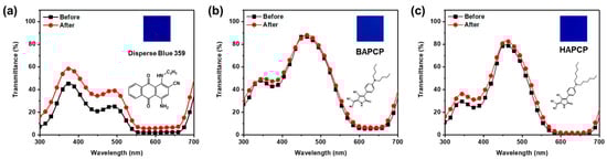 Transmittance spectra of films after the thermal stability test: (a) Disperse Blue 359, (b) BAPCP, and (c) HAPCP (inset: a picture of each fabricated film).
