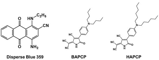 Semiconductor technologies that rely on visual information, including 3D printing, artificial intelligence, big data, cloud computing, and the Internet of Things (IoT), have been progressing rapidly [1]. These technologies are evolving through advancements in visual information, leading to an increased demand for improved performance in cameras and display devices. In particular, enhancing the performance of image sensors plays a critical role in delivering high-quality visuals, making advancements in color filter technology, which directly affects image quality, essential [2,3,4]. The color filter in an image sensor selectively transmits light of specific wavelengths from the full spectrum, converting it into electrical signals. As the demand for high resolution, high definition, and high sensitivity in devices like smartphones and digital cameras increases, the pixel size of image sensors continues to decrease [5,6]. With decreasing pixel size, the quantity of colorant applied per pixel is reduced, underscoring the importance of optimizing the absorption and transmission properties of colorant materials to produce high-quality images in compact pixel structures [7,8]. Specifically, blue colorants for image sensors must maintain high transmittance in the blue region at 450 nm while ensuring low transmittance in the red region at 650 nm [2,3]. To achieve this, the development of new colorant materials with high molar extinction coefficients is required, along with thermal stability that can withstand high-temperature manufacturing processes [9,10,11]. High-temperature conditions can negatively affect the stability and performance of materials, so developing materials that meet these requirements is a crucial area of research for high-performance image sensors. Examples of colorants used in blue color filters include xanthene, cyanine, azo, anthraquinone, dioxazine, triarylmethine, and pyrrole [12,13,14]. These compounds are suitable as color filter materials for displays due to their excellent optical and thermal properties and ease of synthesis. However, there are still issues related to thermal stability that need to be addressed before they can be applied to color filters for image sensors [3,15]. J.Y. Jaung’s group reported improved thermal and chemical stability by producing a dense thin film using an azo blue colorant with cross-linkable acrylate additives [16]. Y.I. Park’s group reported a blue material based on dimerized triarylmethine derivatives [17]. This approach resulted in superior optical and thermal properties by incorporating two chromophore moieties within a single molecule through dimerization. In particular, pyrrole colorants can be considered superior candidate materials for blue color filters due to their high transmittance and strong color intensity in the 400–500 nm wavelength range [18]. J. Park’s group combined a dimeric triarylmethine derivative, ABD, with an anthraquinone derivative, PAQ, to enhance the optical properties and stability of blue colorants [19]. The study reported that by mixing these two different colorants, the thermal and chemical stability was improved while the optical properties of the material were maintained. In this study, two new pyrrole derivatives, 2-(3-cyano-4-(4-(dibutylamino)phenyl)-5-oxo-1,5-dihydro-2H-pyrrol-2-ylidene)malononitrile (BAPCP) and 2-(3-cyano-4-(4-(dihexylamino)phenyl)-5-oxo-1,5-dihydro-2H-pyrrol-2-ylidene)malononitrile (HAPCP), were designed and synthesized as blue colorants, and their optical and thermal properties were analyzed. J.C. Kim’s group previously reported a study on the dispersibility of Disperse Blue 359, a representative blue material, using a polymer dispersant, and they developed a method for predicting dispersibility [20]. Because of this, Disperse Blue 359 was selected as a reference material for comparative evaluation in this study.