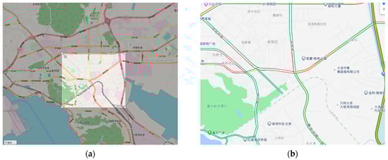 To verify the traffic situation created by the software, we compared it to the real traffic data. In this study, a macroscopic-scale verification method was used. AutoNavi map [53] is supported by AutoNavi Software Co., Ltd. (Beijing, China), which provides real-time traffic in three colors: red indicates congestion, with an average speed of less than 5 km/h, yellow indicates a low speed, with an average speed of 5–30 km/h, and green indicates smooth traffic, with an average speed over 30 km/h. The traffic data in the AutoNavi map were collected in real time from different sources: 15% of data were from the traffic control department of the city, and AutoNavi map users accounted for the remaining 85% of data. In most cities in China, AutoNavi cooperates with taxi companies to gain their floating car data (FCD). AutoNavi obtains FCD from each user while they are uploading their position during navigation. Though these sources, AutoNavi obtains real-time traffic data with high accuracy and fidelity.