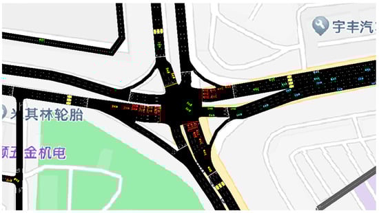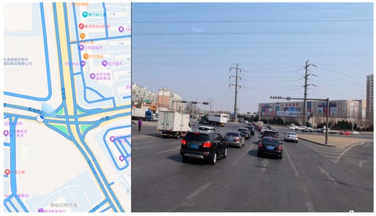 For traffic simulation, the accuracy of the simulation is crucial to the credibility of the simulation results. In this work, the road network was imported from OSM (Open Street Map) into SUMO and then calibrated through the street-view map on Baidu Maps. During the calibration process, based on the street-view map, the type of lane (public road/company internal road/non-motorized lane/highway/train track, etc.) was identified, while we corrected the number of lanes, the direction of traffic at the intersection (Figure 2), and whether there was a traffic light at the intersection. Since many intersections are large, the original road network imported by OSM often splits one intersection into several intersections (usually equipped with several traffic lights). During the calibration process, these intersections needed to be restored to one intersection.