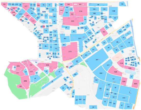 A previous work confirmed the accuracy of using population data to generate traffic demand [47], and the current study also used the same method to generate traffic demand. Figure 3 shows the regional division of the population information used to generate traffic demand. The pink areas are the residential areas, and the numbers above are the numbers of households in the area. The data were sourced from Lianjia.com, the largest local real estate agency. The blue areas are workplaces, and the number above is the number of workers. These data were derived from the number of employees that the companies in this area paid social security for [48]; these data were all public data, available on the Internet.