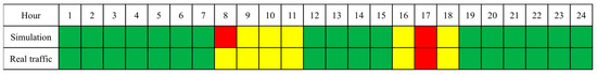 Comparison of simulated traffic and real traffic status. The colors represent the average speed of the vehicle when passing the verification point: green represents more than 30 km/h, yellow represents 5–30 km/h, and red represents less than 5 km/h.