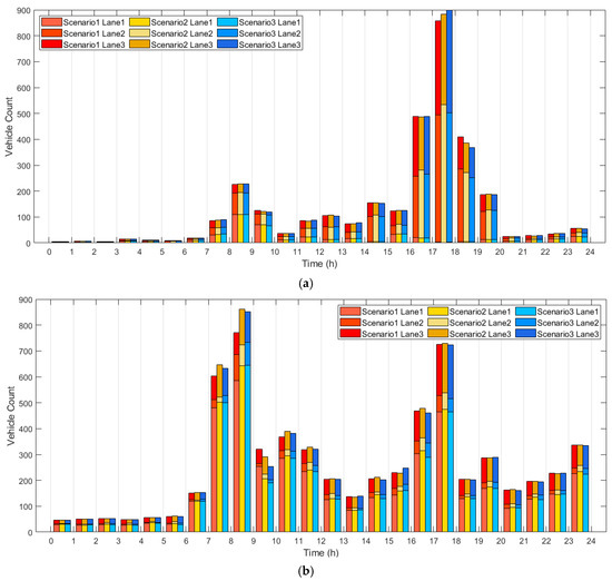 Figure 7 shows a set of inductive loop data results. Figure 7a shows the inductive loop data recorded at the bottom (south) of Figure 6, and Figure 7b shows the set recorded to the left (west) of Figure 6. Each column is the sum of the number of vehicles in the three lanes per hour. The route files of the vehicles in each scenario were the same, that is, the paths and departure times of the vehicles were the same, but the number of vehicles passing through this set of inductive loops was different in each scenario. Figure 7a shows that, during the morning peak congestion period (between 8 and 9 o’clock), more vehicles passed through the point in Scenario 2 than in Scenario 1, and the number of vehicles passing through the point in Scenario 3 was essentially the same as in Scenario 2. During the evening rush hour (between 17 and 18 o’clock), when the traffic volume increased significantly, the vehicle count in Scenario 2 was higher than in Scenario 1, and in Scenario 3, it was even higher. This showed that, at this intersection, the traffic efficiency of autonomous vehicles was higher than that of non-automated vehicles, and the traffic efficiency of anthropomorphic driving was higher than that of non-automated vehicles and, at least, not lower than that of autonomous vehicles. Meanwhile, the road section shown in Figure 7b was more congested during the morning rush hour. Between 7 and 9 o’clock, the count of vehicles in Scenarios 2 and 3 was significantly higher than in Scenario 1, but the count in Scenario 3 was slightly lower than in Scenario 2. This shows that the traffic efficiency of both autonomous driving and anthropomorphic driving is higher than that of non-automated vehicles, but the traffic volume of anthropomorphic driving on this road section is slightly lower than that of autonomous driving.