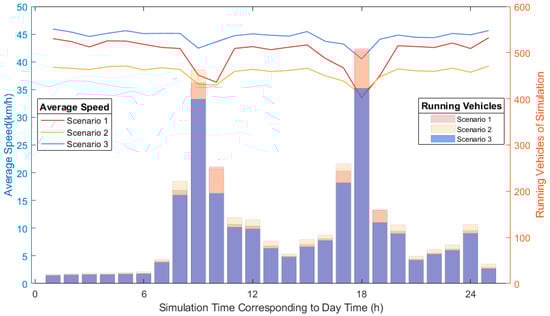 Figure 9 shows the average speed of vehicles at each hour under each scenario, as well as the average number of vehicles running in the simulation in that hour. In terms of average speed, the average speed in Scenario 2 was the lowest most of the time, but the average speed in Scenario 2 was higher than in Scenario 1 during the most congested periods (between 17 and 18 o’clock). This shows that the average speed of autonomous vehicles is lower than that of human drivers most of the time, but in congested road conditions, the average speed of autonomous vehicles is higher than that of human drivers. The average speed of Scenario 3 is higher than that of Scenarios 1 and 2, which shows that anthropomorphic driving has more advantages in terms of average speed. During the particularly congested time period from 17:00 to 18:00, the average speed of anthropomorphic driving was 21.29% higher than that of non-automated driving and 19.05% higher than that of automatic driving.