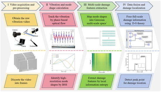 The workflow of the proposed damage detection method is presented in Figure 1. Steps 1 and 2, combined, form the basis of the vision-based measurement. Utilizing the vibration video captured in step 1, step 2 adopts phase-based optical flow estimation algorithm to acquire vibration signals and identifies high-spatial-resolution mode shapes of the structure through blind source separation (BSS) and independent component analysis (ICA). Step 3 involves the extraction of multi-scale damage features, with the acquired mode shapes being mapped into Gaussian multi-scale space to suppress the measurement noise. Local information entropy (LIE) is computed at each scale to characterize local damage-induced irregularities in mode shapes, resulting in the novel damage index MS-LIE, which manifests multi-scale damage information. Step 4 employs a data fusion algorithm based on D-S theory to fuse the damage information at all scales, thereby facilitating a global assessment of the damage state and enabling a definitive identification of the damage location.
